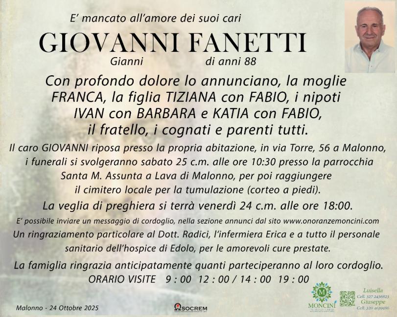 Sentite condoglianze per la perdita del caro Giovanni. Un abbraccio a tutti i famigliari. Ronchi Teresa, Gianfranca e Rolando Torri